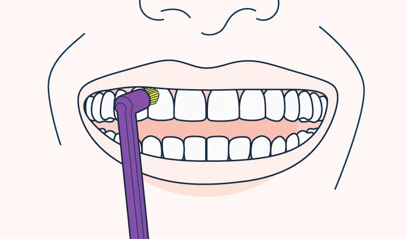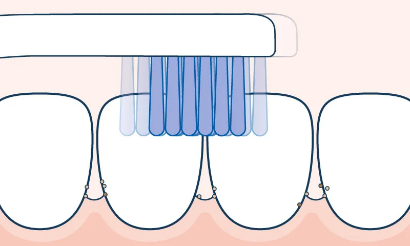 Use a single tuft brush to make precise, gentle, “shaking” movements along the gumline – from one side of the tooth to the other.
