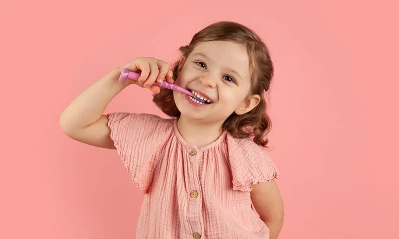 From your child’s second birthday at the latest, brush their milk teeth twice a day for at least two minutes: once after breakfast and once before bedtime. Use a maximum of a pea-sized amount of low-fluoride children’s toothpaste.
