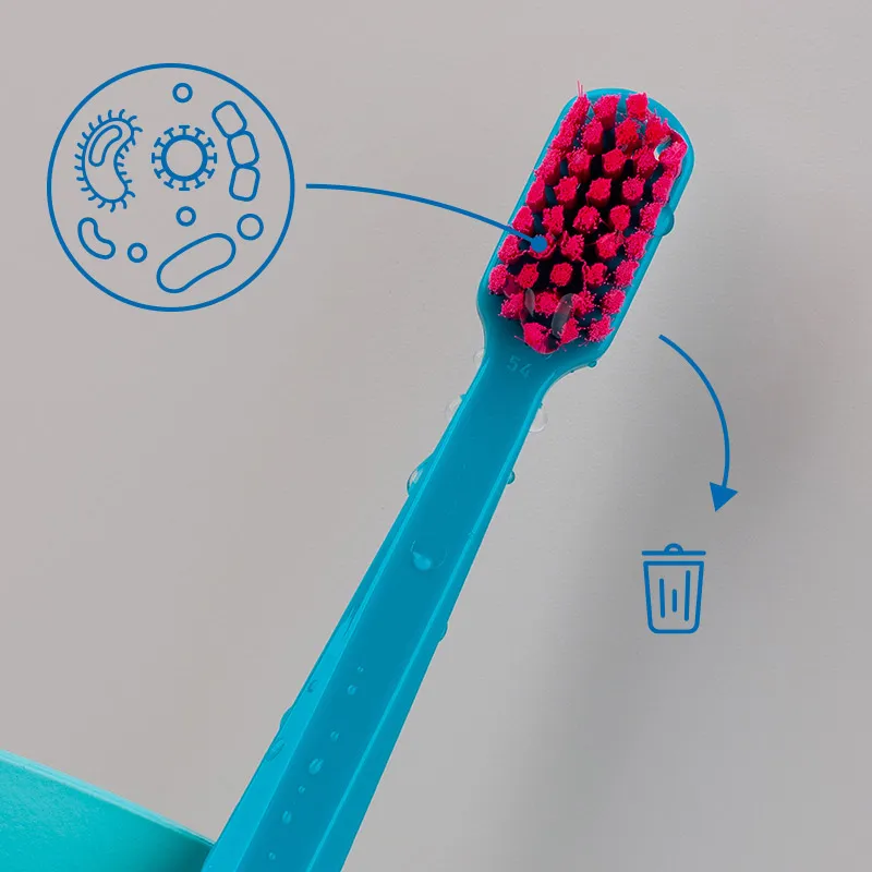 A toothbrush is a dental hygiene instrument that should be used for approximately three months, but many of us neglect to follow this simple advice. There are two important reasons why a toothbrush should be replaced regularly: firstly, as a result of mechanical wear, the bristles start to bend, leading to insufficient removal of dental plaque over time. The second reason is the rapid accumulation of bacteria, which tends to grow much faster in moist environments.